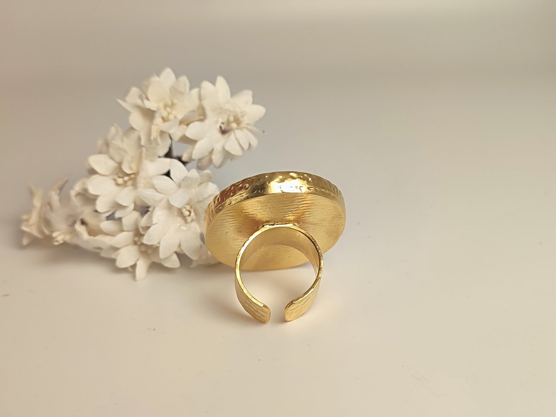 This handmade picture jasper large stone ring brings together the grounding energy of nature with a touch of modern luxury. The richly patterned jasper stone, in warm sandy browns and golden streaks, is beautifully set in a 24k gold-plated adjustable band. Its chunky, sculptural design makes it a standout piece while remaining comfortable and hypoallergenic. Each ring is crafted in the UK, ensuring every stone’s unique landscape-like markings tell their own story — a statement ring for those who love natural elegance with a bold twist.