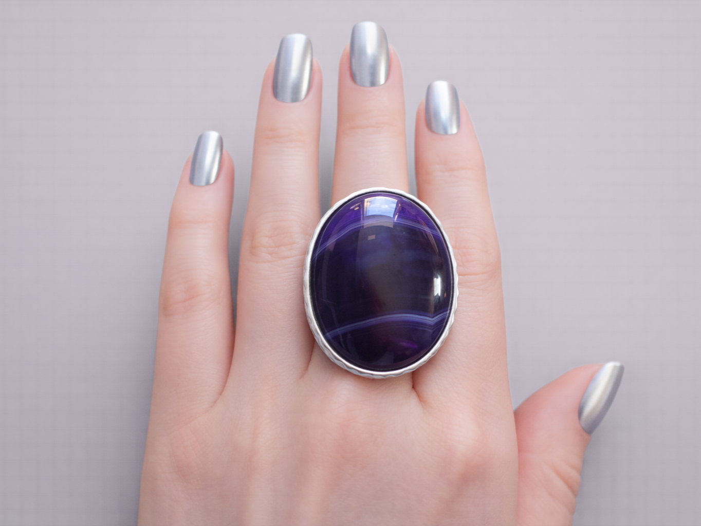 This stunning unique one of a kind oval ring features a vibrant purple Agate gemstone with unique Agate detailing. Its bold, glossy finish and intricate pattern make it a standout accessory for any occasion. The adjustable band ensures a comfortable fit, making it a versatile and stylish addition to your jewellery collection