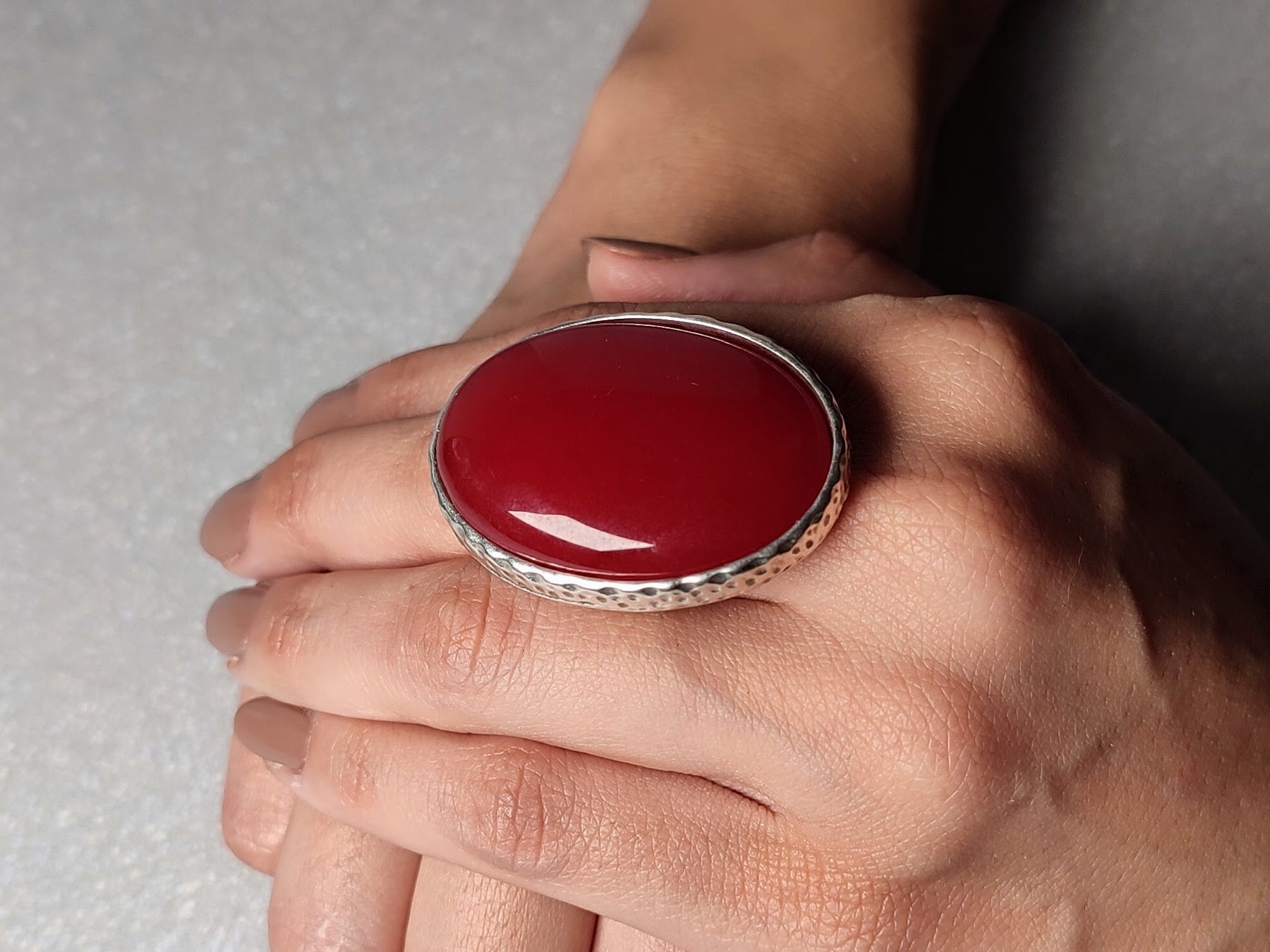 This bright red Malaysian Jade ring is perfect for making a statement. Handmade with a vibrant ruby-coloured semi precious gemstone , the adjustable oval chunky design serves as a timeless piece of red jewellery. Perfect for any occasion.