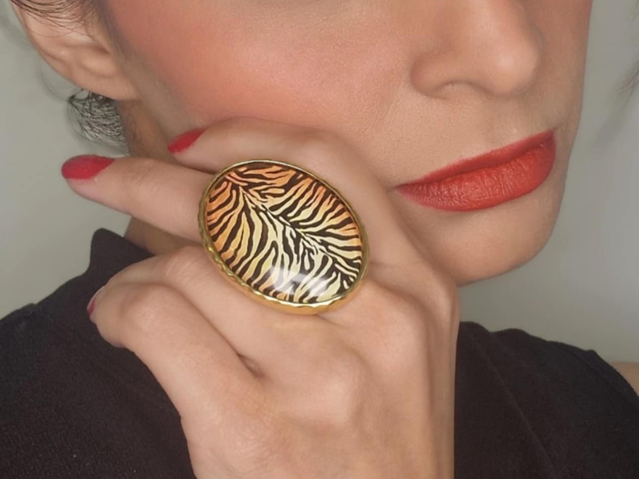This tiger print statement ring brings a fierce, fashion-forward edge to any outfit. Available in 24k gold or 925 silver plate, the large oval design features a bold tiger stripe pattern that captures the strength and style of modern UK fashion. Made from hypoallergenic materials and fully adjustable, it’s designed for comfort without compromising on impact. The glossy finish enhances the animal print’s detail, creating a standout piece that’s both stylish and versatile. Handcrafted in the UK and presented in eco-friendly gift packaging, this ring is perfect for anyone who loves confident, statement jewellery with attitude