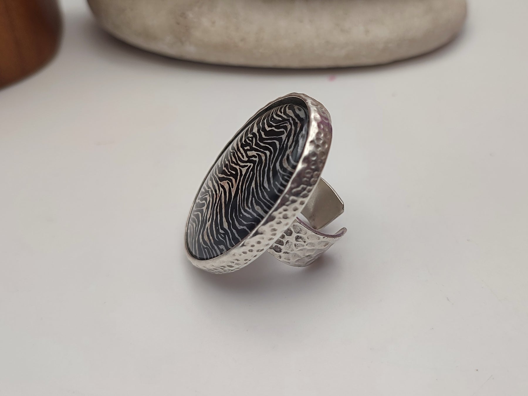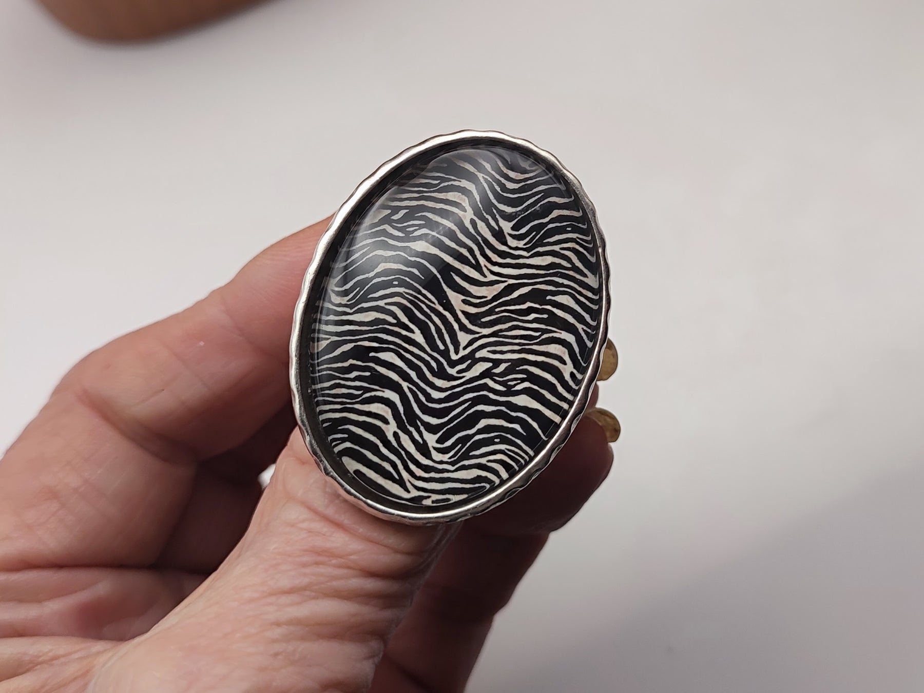 Bold yet effortlessly chic, this Zebra Print Statement Ring brings a touch of wild sophistication to your look. The striking black and ivory pattern is sealed beneath a glossy, domed resin finish, creating a smooth, tactile surface that catches the light beautifully. Set in a handmade silver or gold plated frame with an adjustable band, it combines comfort with standout style. Whether paired with a sleek monochrome outfit or layered with other bohemian pieces, this ring makes an unforgettable statement. Arrives beautifully gift ready, perfect for those who love accessories with character and confidence