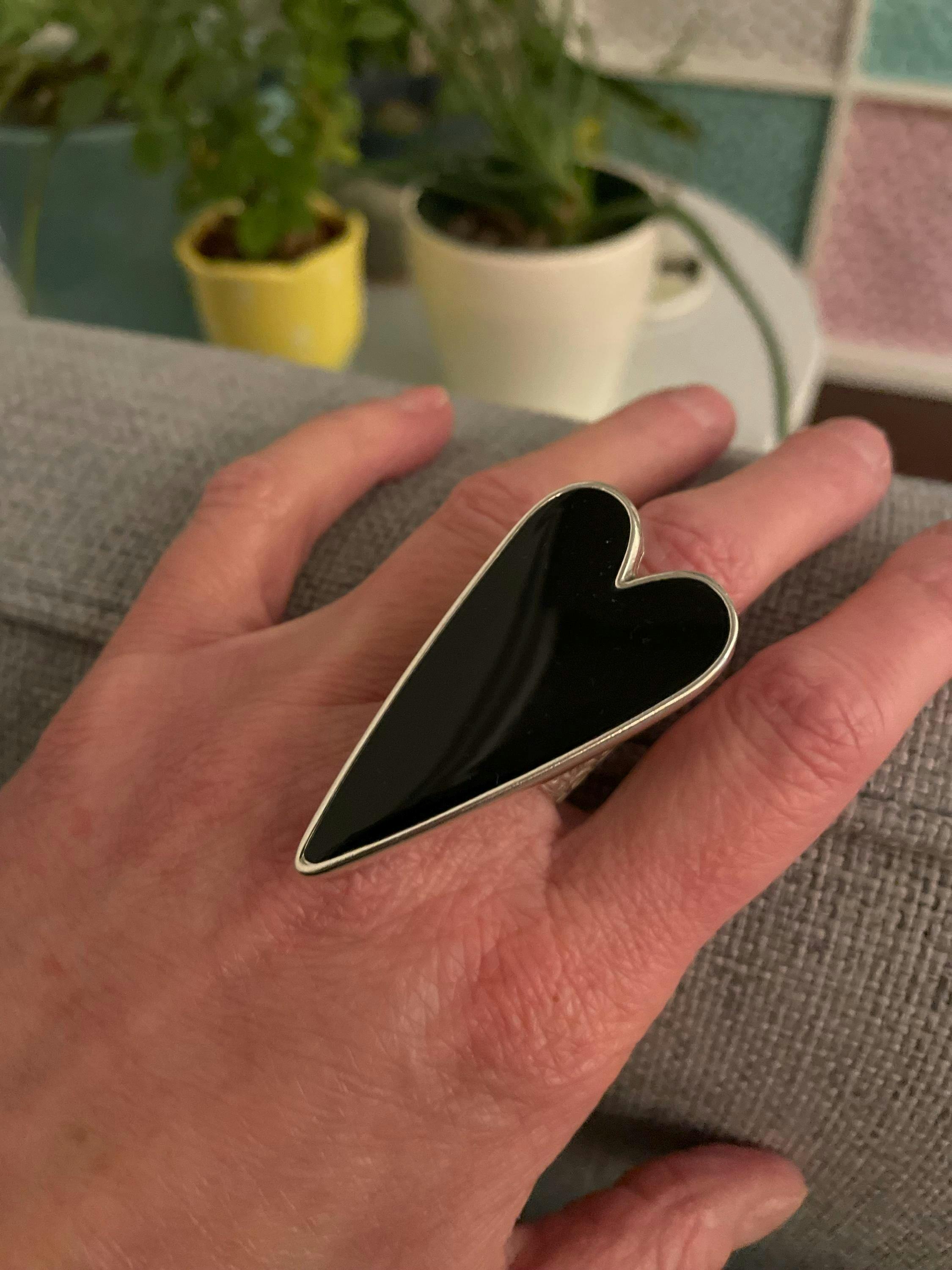 Introducing Morticia, a unique costume statement ring with a large oversized black heart filled with glossy black resin and an adjustable band to fit most sizes. This black jewellery stand-out accessory will be sure to make an impression.