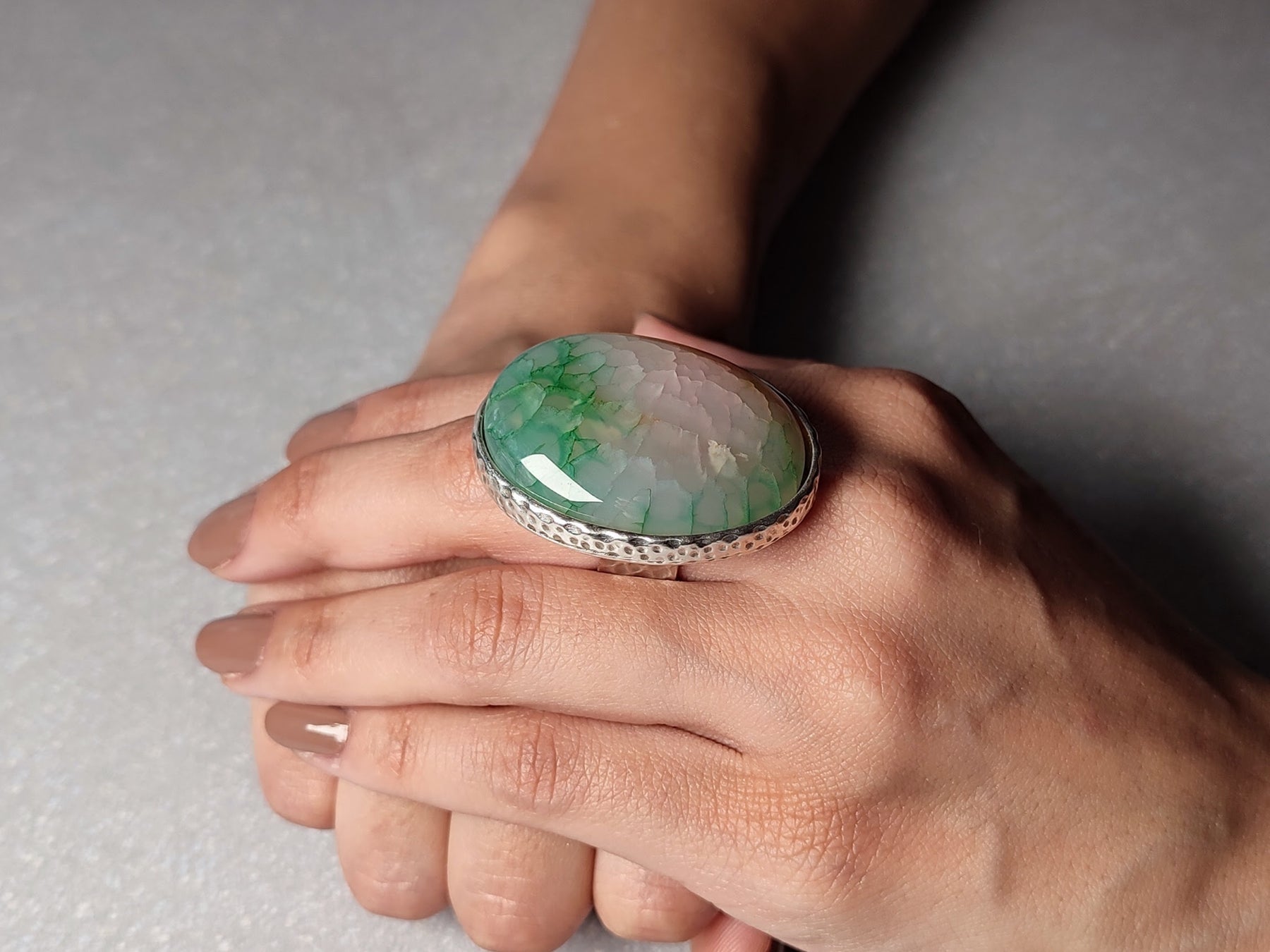 This pink and green crackle agate statement ring is bold, natural, and beautifully unique. The large oval stone features a stunning crackle texture that catches the light from every angle, making it a true one-of-a-kind piece. Set in silver and made with hypoallergenic materials, it’s safe for sensitive skin and fully adjustable for a perfect fit. Designed for those who love modern style with natural character, this ring is handcrafted in the UK and delivered in eco-friendly UK gift packaging — ideal for gifting or adding a bold touch to your own collection of modern statement jewellery.
