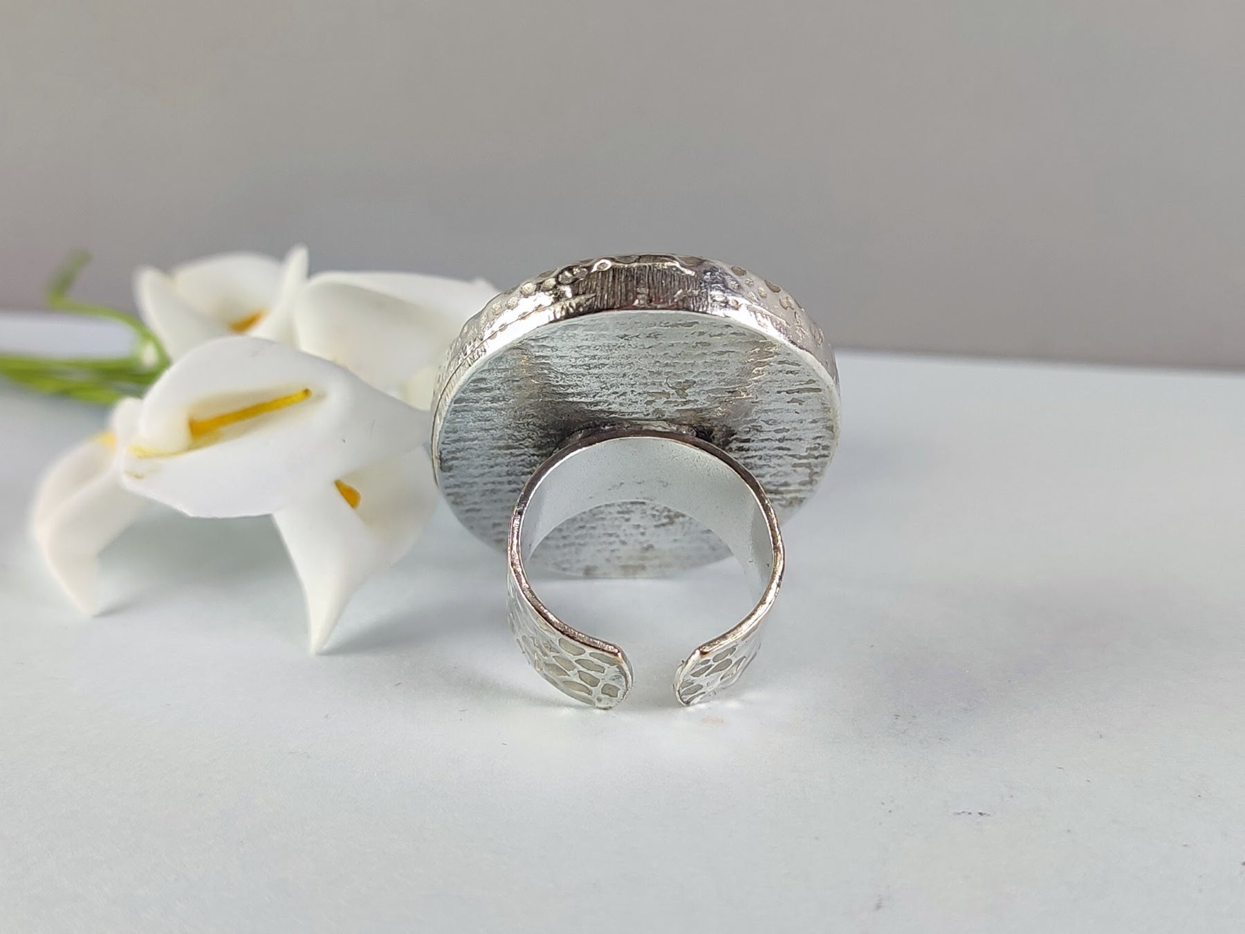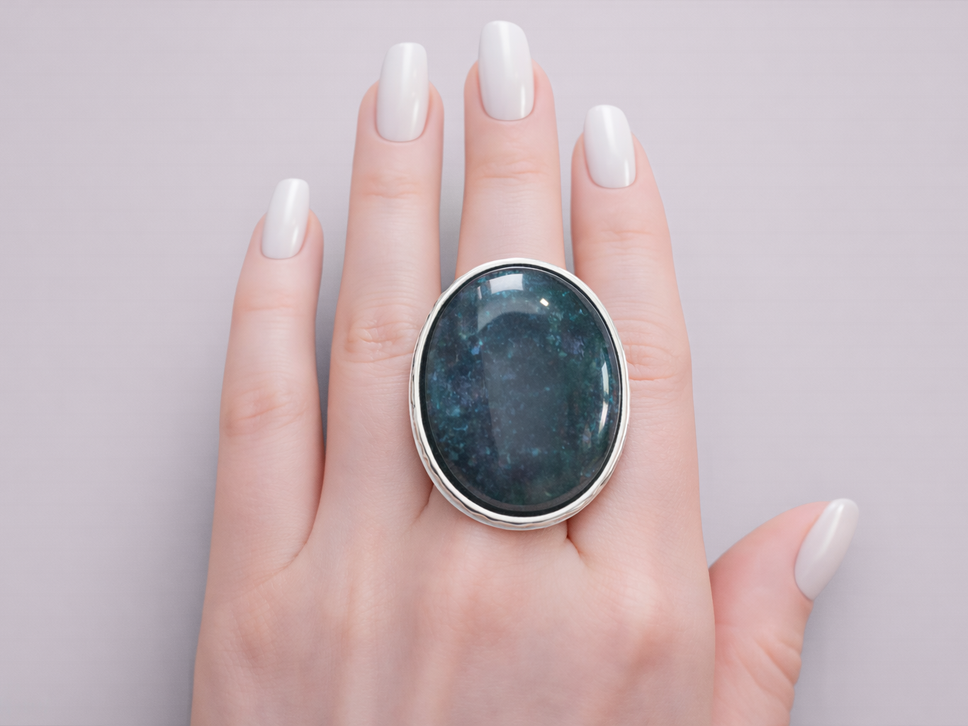 This Indian Agate statement ring radiates grounding energy and natural elegance. Featuring a large oval gemstone, the stone’s deep green tones with subtle variations reflect the serene beauty of nature. Perfect as a chunky gemstone ring, it adds a sophisticated and earthy touch to any look. The adjustable, hypoallergenic band ensures a comfortable fit, while its handmade finish gives it a timeless, artisan feel. A bold yet versatile costume ring, ideal for lovers of natural gemstones and unique jewellery.