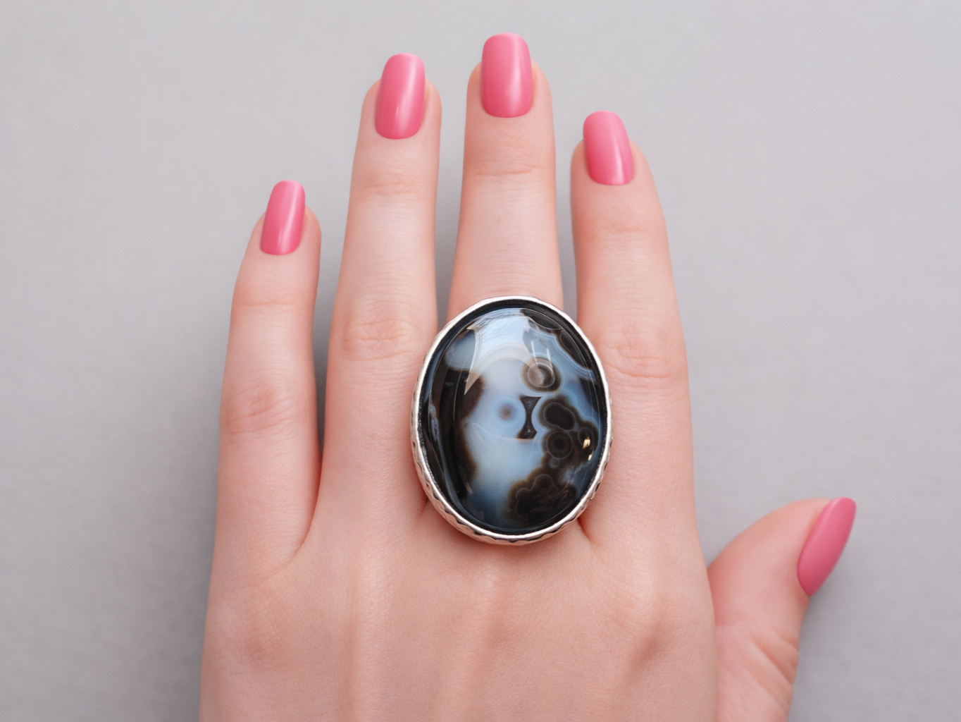 Meet the luxurious black and white Foliage ring. Crafted with a large, oval Agate gemstone in black with hints of white, this statement piece is perfect for adding a touch of sophistication to any outfit. The adjustable design allows for a perfect fit, making it a versatile and exclusive addition to your jewellery collection.