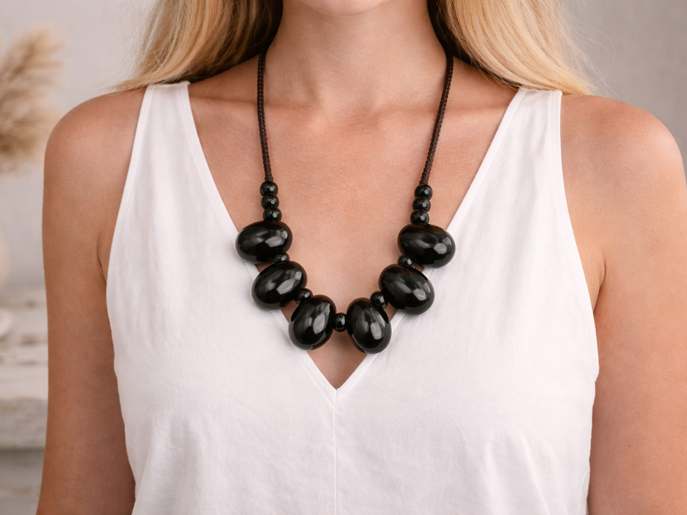 This long black ceramic bead necklace is strong, simple and made to stand out. The glossy handmade ceramic beads give it a clean, bold finish, while the chunky graduated design adds real presence without feeling overdone. It is the kind of necklace that works instantly with a plain top, a smart dress or an all-black outfit that needs one solid focal point.