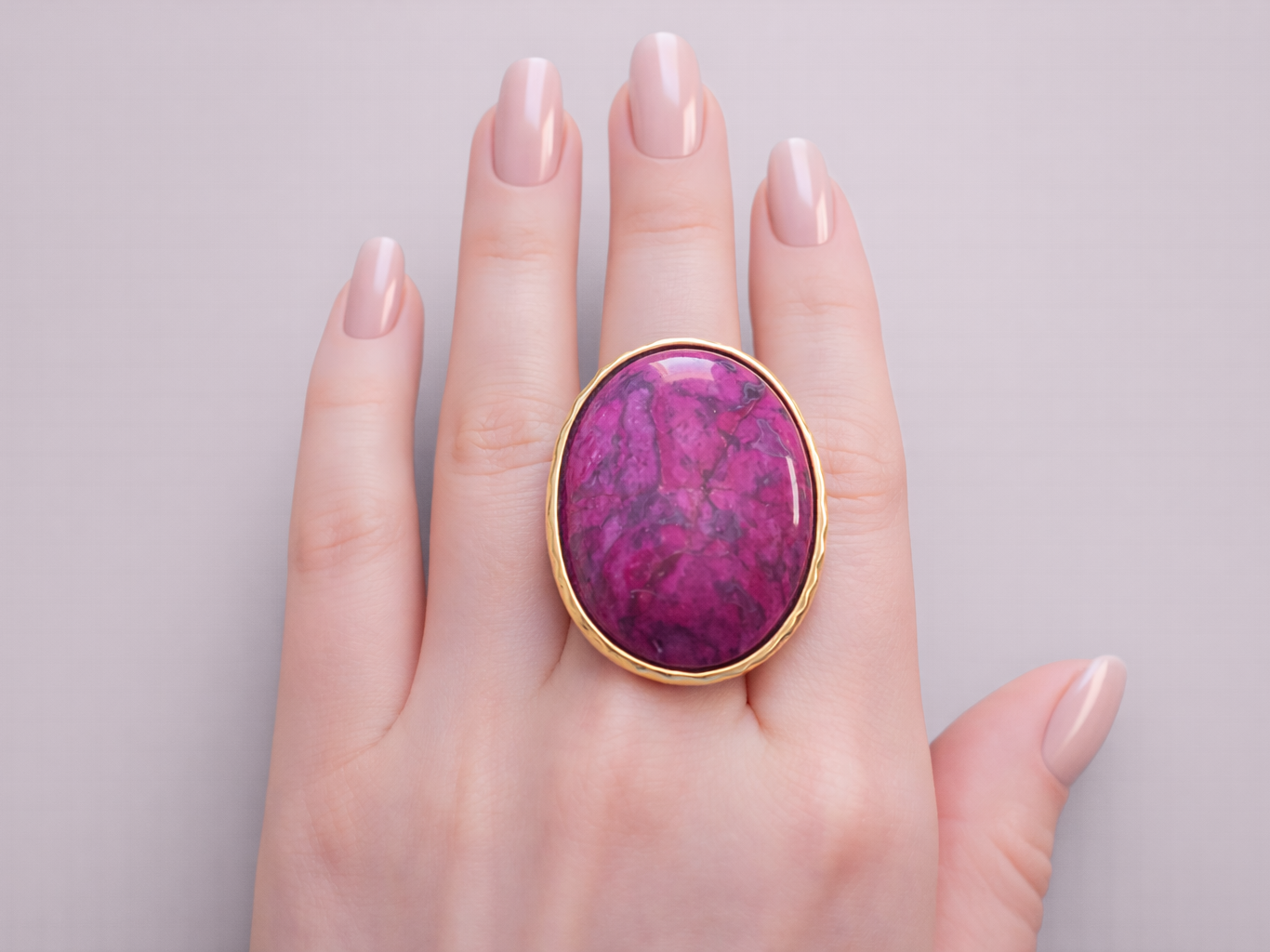 This Purple Jasper statement ring in gold is a bold expression of elegance and individuality. The large oval gemstone glows with deep magenta and violet tones, beautifully framed in a warm gold setting. Designed as a chunky gemstone ring, it’s perfect for adding a touch of confidence and color to your look. The adjustable, hypoallergenic band ensures a comfortable fit, while the handmade craftsmanship gives each piece a unique character. A captivating costume ring that blends earthy charm with modern glamour.