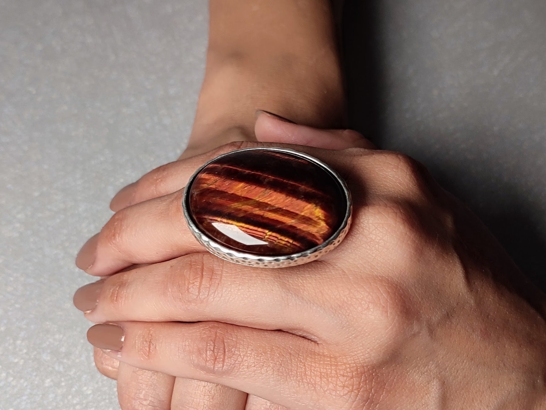 This Red Tiger’s Eye statement ring features a large oval gemstone set in silver zamak with a bold, polished finish. Corky and Stoner is a UK-based jewellery brand, creating handmade, adjustable and hypoallergenic pieces designed to stand out. Each ring arrives in a gift-ready box, ready to wear or give.