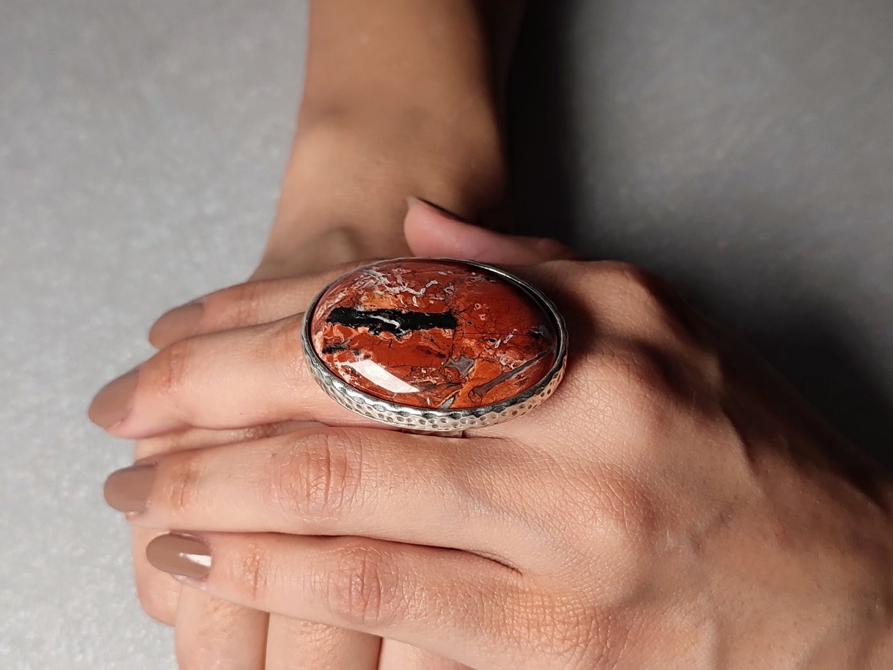 This silver jasper statement ring is a bold piece that balances natural detail with modern design. The large, polished jasper stone features deep earthy tones and striking natural patterns, giving every ring a unique finish. Set in textured silver plated Zamak with an adjustable, hypoallergenic band, it’s made for comfort and everyday wear. Handcrafted in the UK, this ring is perfect for anyone who loves distinctive, nature-inspired jewellery with a modern edge. Delivered in eco-friendly UK gift packaging, it’s a standout piece and a thoughtful gift for fans of statement gemstone jewellery.