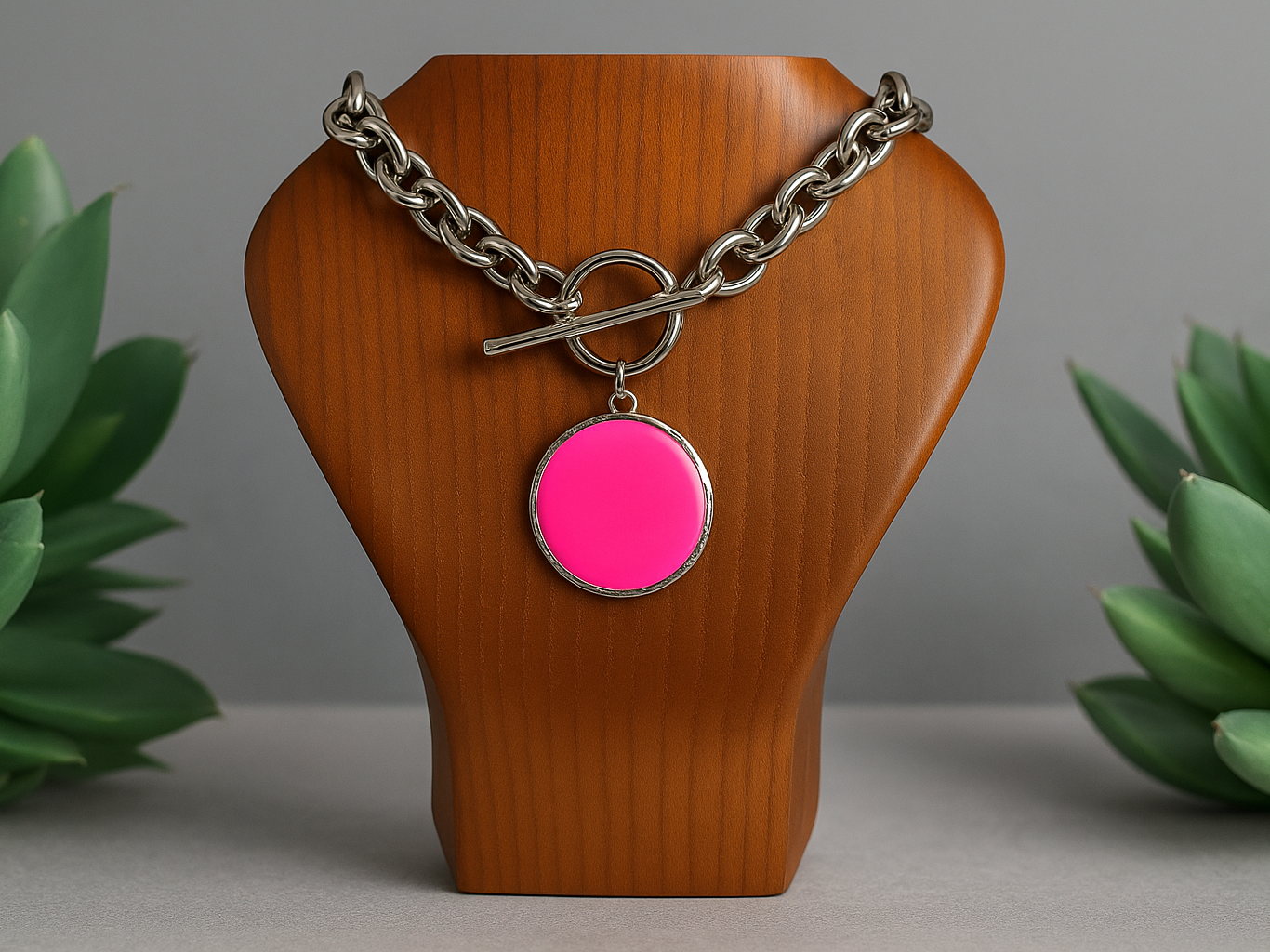This neon pink statement necklace is 40 mm in diameter and is bold, heavy, and built to stand out. Made from durable stainless steel, it features chunky chain links and a clean T-bar fastener for an easy, modern finish. The large neon pink pendant adds a hit of confident colour that catches attention without trying too hard. Designed for impact and comfort, this piece brings modern statement jewellery UK style to any outfit. Handcrafted in the UK and made for those who like strong, standout accessories.