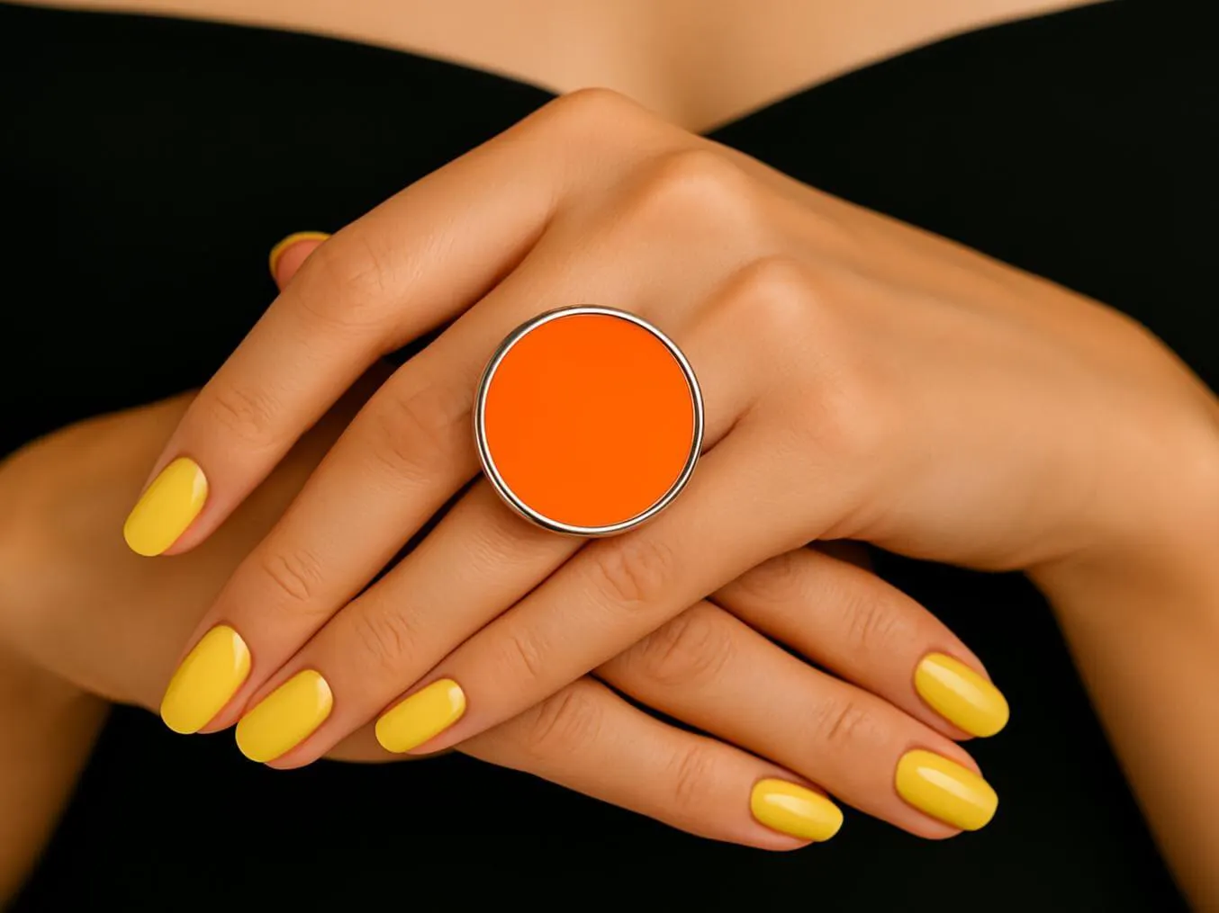Add instant impact with this neon orange statement ring — bold, bright, and built to stand out. Crafted from silver-plated Zamak, this 30mm round ring has a clean, modern look and an adjustable band for a perfect fit. It’s hypoallergenic and comfortable for everyday wear. Designed in the UK, this piece is part of a new wave of modern statement jewellery UK, offering strong colour and confident simplicity in one easy accessory.