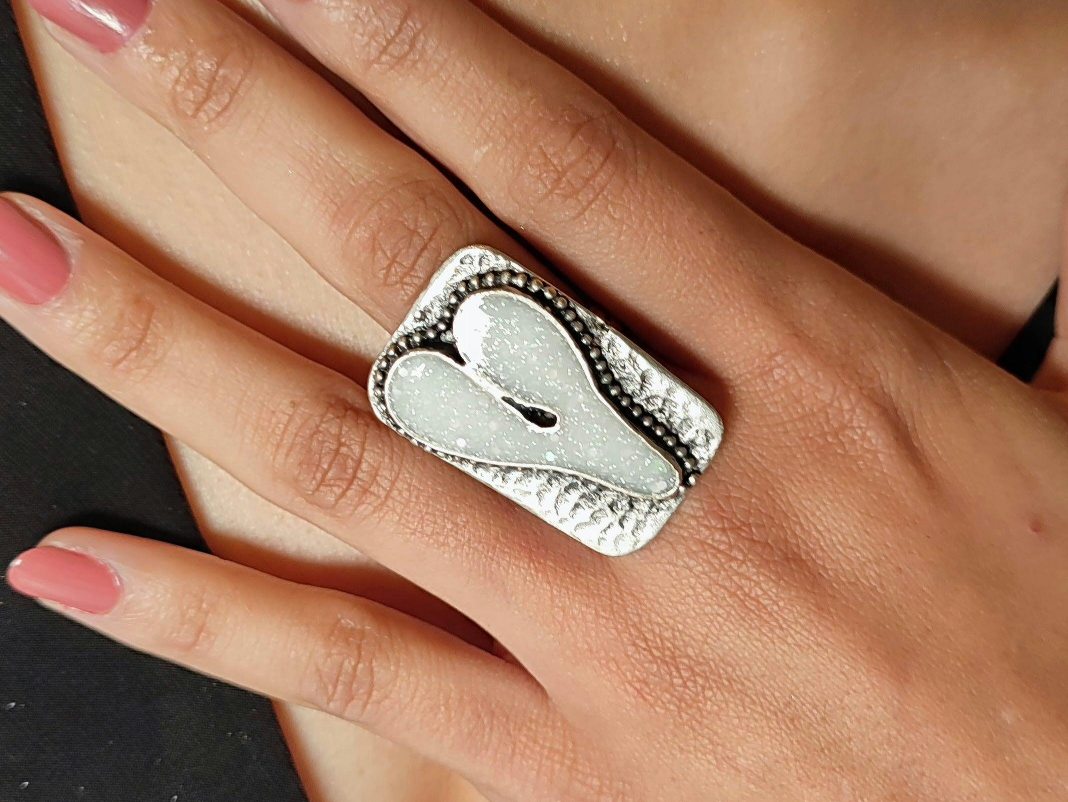 This is a stylish statement ring featuring a large white glitter-filled heart-shaped design. Adjustable to fit and ideal for parties or special occasions, the ring is perfect for adding a touch of shimmer to your look.