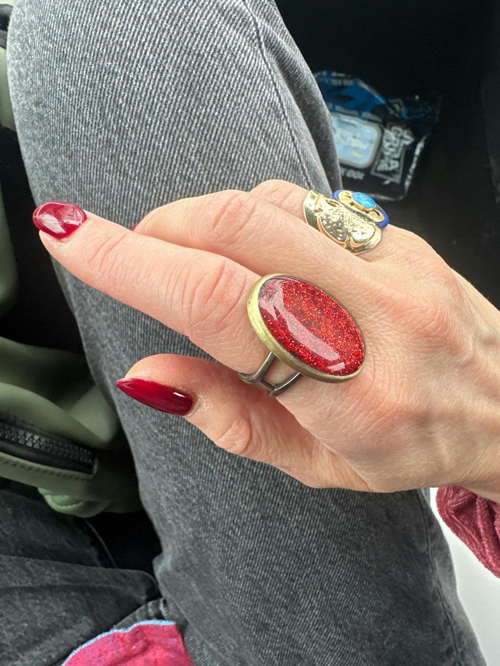 A stylish fashion piece with a unique sparkle, an oval red glitter cocktail ring handmade with adjustable sizing, bold red glitter, and an oval design. This elegant ring will brighten any outfit.